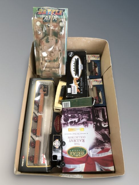A group of boxed models including a Corgi Vintage Glory of Steam foden dropside with two trailers and barrel load, in box, further models by Days Gone, model battle tank, etc. (1 box)
