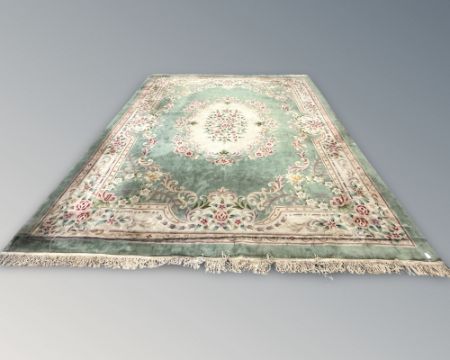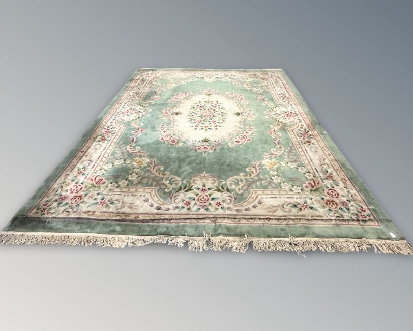 A large Chinese floral woolen carpet on green ground, 480 cm x 365 cm.