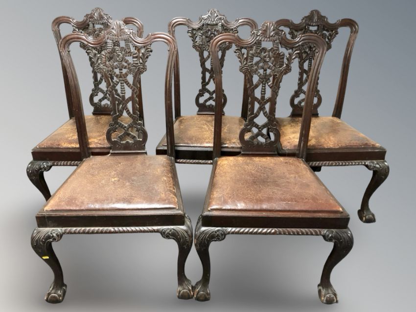 An early 20th century carved mahogany extending dining table, with leaf, 177 cm x 105 cm x 77 cm high, together with five carved mahogany dining chairs