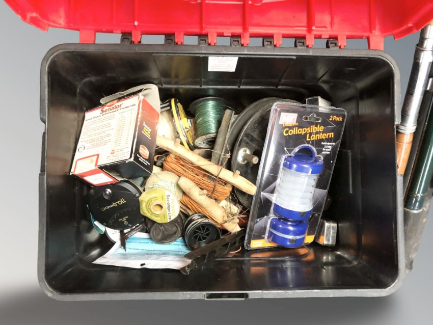 A quantity of fishing equipment, two storage stools and contents, bundle of rods, etc.