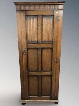 An oak linen fold sentry door cabinet, 76 cm x 43 cm x 181 cm.
