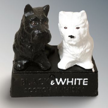 A cast iron group of two scottie dogs 'Black and White' scotch whisky, height 15 cm.