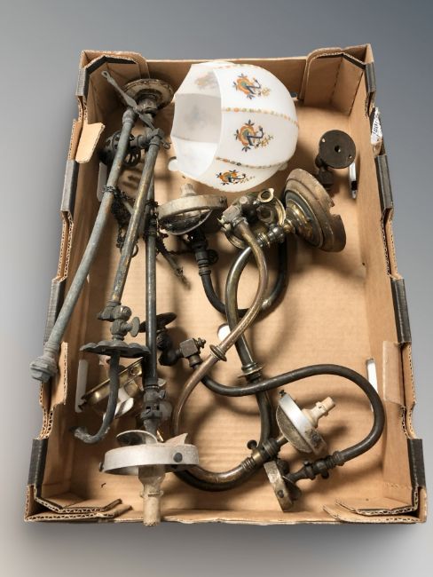 A group of antique brass wall light fixtures, opaque shade, etc. (1 box)