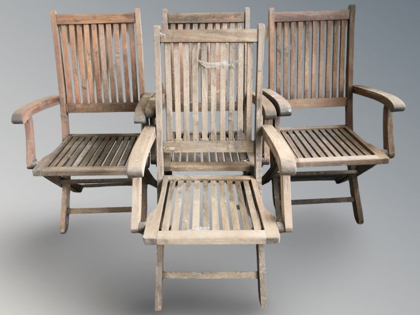 A set of four teak folding garden armchairs.