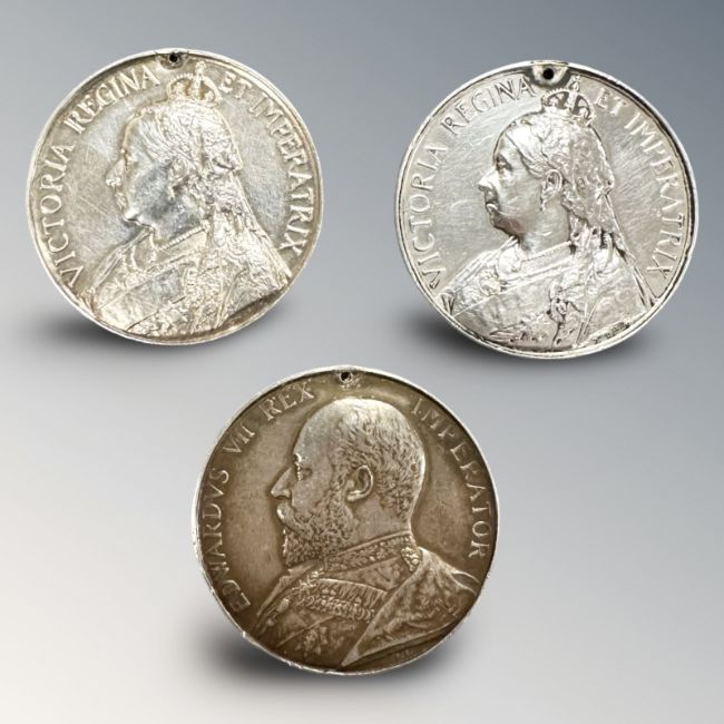 A Queen's South Africa Medal named to 8896 L/Cpl M.H. Ryan Grenadier Guards, another unnamed, and a King's South Africa Medal named to 4560 Pte. J. G. Hogben 2nd D.C.L.I. (3, named examples have been renamed, all lacking suspenders)