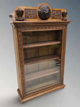 A late Victorian carved oak and glazed single door wall cabinet bearing initials 'G E 1900 1901', with key, height 74 cm.