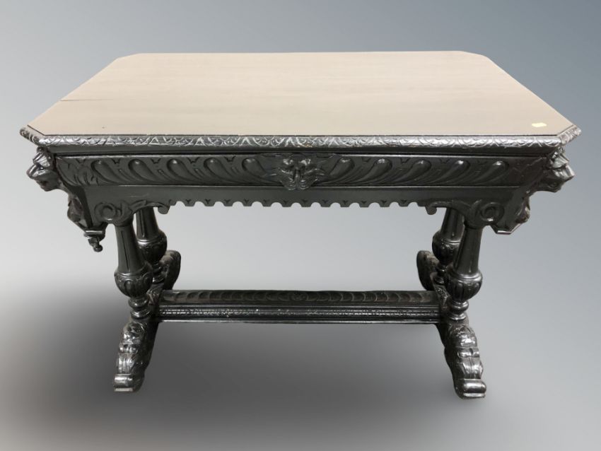 A Victorian heavily carved and ebonised oak library table, fitted a drawer, 107 cm x 68 cm x 75 cm.