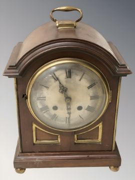 An early 20th century oak eight day bracket clock with brass and silvered dial, height 36 cm, with pendulum, and a mahogany and brass bracket clock with battery movement, height 32 cm.