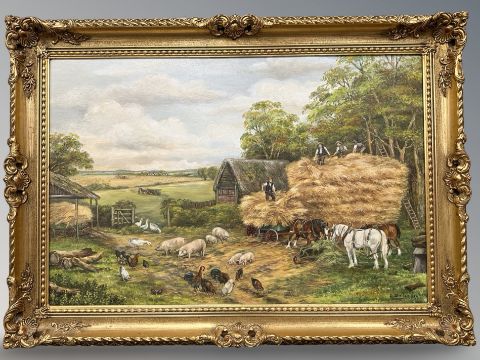 Ella Bailes : Workhorses and poultry in a yard, oil on canvas, 49 cm x 75 cm.