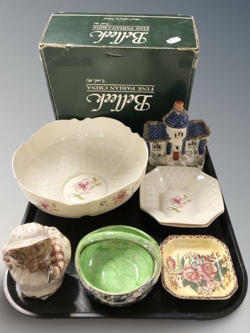 A Belleek porcelain fruit bowl with box, diameter 24 cm, a further pair of octagonal dishes, two pieces of Maling Ware, a Staffordshire flatback house and a Doulton Beswick Ware figure 'Mrs Tiggywinkle'.