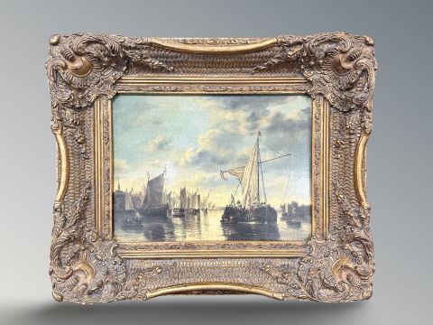 A gilt framed picture depicting trading ships in a dock, 29 cm x 39 cm.