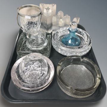 A graduated set of three textured glass tealight holders, Caithness perfume bottle and stopper, other glass vessels, basket, etc.