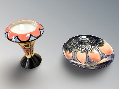 A modern Moorcroft New Forest pin dish, designed by Rachel Bishop, diameter 11.5cm, and a Lorna Bailey Old Ellgreave Pottery vase. (2)