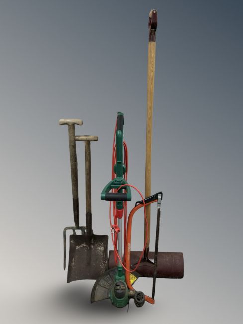 An electric strimmer and several hand tools