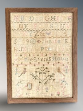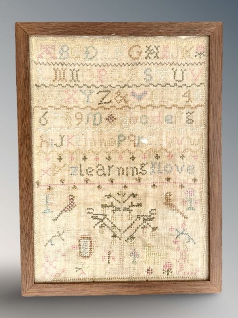 An old tapestry alphabet sampler 30 cm x 22.5 cm, in contemporary frame