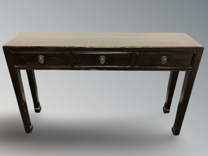 A Chinese lacquered pine three drawer side table, 130 cm x 30 cm x 80 cm