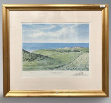 After Kenneth Reed F.R.S.A. (British, Contemporary) : 17'th Hole, Bamburgh Castle Golf Club, Northumberland, England, 2003, reproduction in colurs, numbered 1 from the limited edition of 350, signed in pencil by the artist, with printed remarque at bottom right depicting Bamburgh Castle, 40 cm x 52 cm, framed.