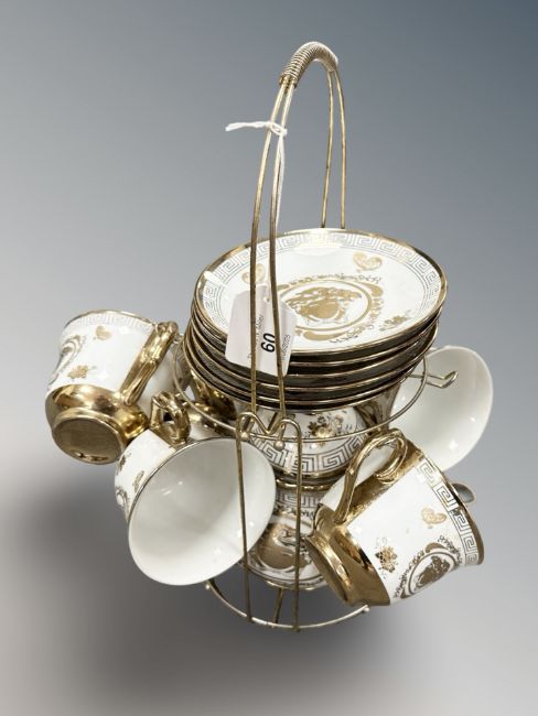 A Versace style china tea set on metal two tier stand including teapot, six saucers and five cups