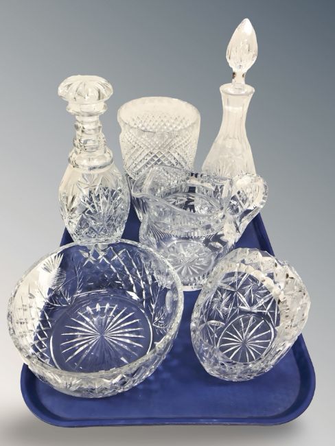 Six pieces of cut crystal and glass including decanters, wine cooler, etc.