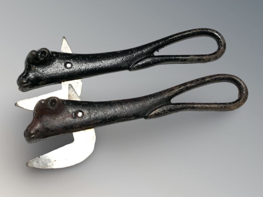 Two vintage can openers in the form of bulls, length 16 cm.