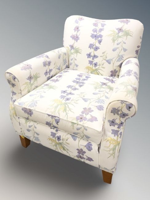 A contemporary armchair in floral upholstery.