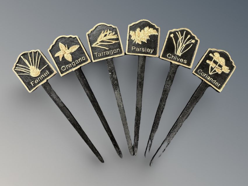 Six cast iron garden herb spike signs, length 26 cm.