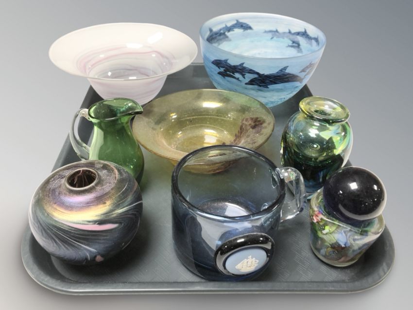 A group of studio glass vases and bowls, Wedgwood mug, etc.
