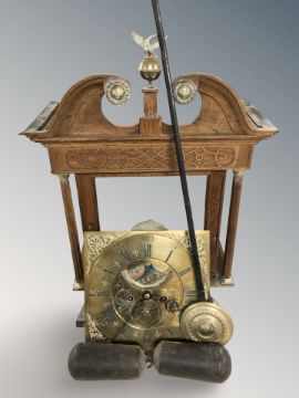 A carved oak long case clock hood and movement with 12" brass moon phase dial, two weights, and a pendulum. (1 box)