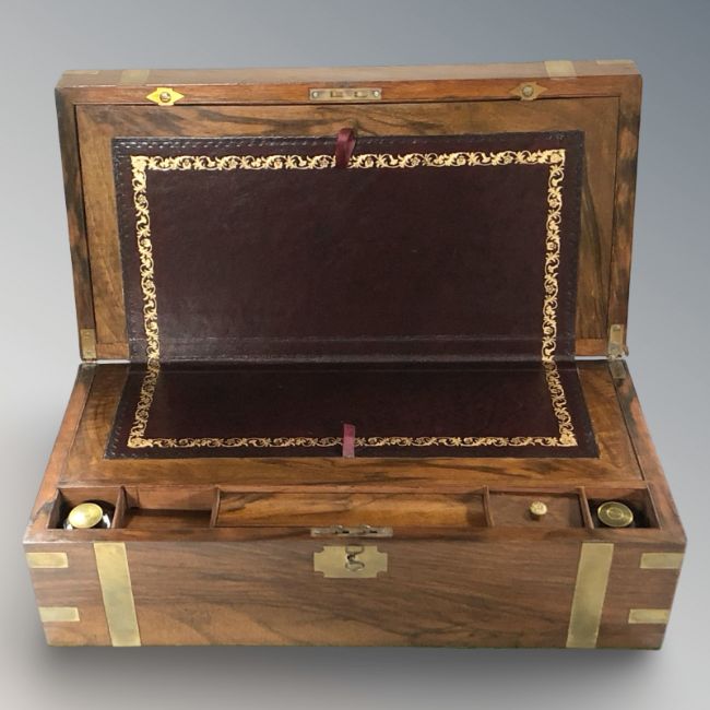 A good quality Victorian figured walnut and brass mounted writing slope, interior with gilt Burgundy leather writing surface and pair of ink wells, with presentation inscription to exterior, width 50 cm.