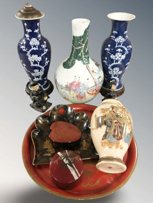 Oriental wares including two Chinese blue and white porcelain baluster vases decorated with prunus, a further bottle vase depicting figures in a garden, lacquered items, etc. (1 box)