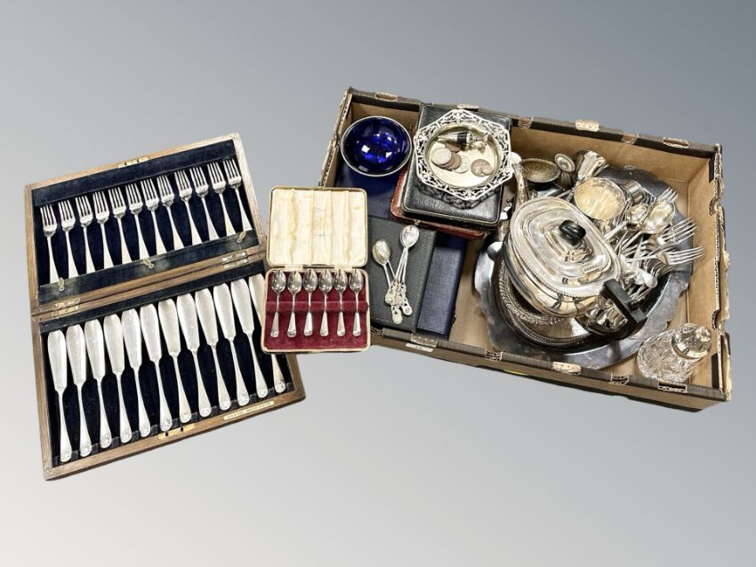 A quantity of silver and silver plate, the silver including a boxed set of six silver teaspoons, a set of five continental teaspoons stamped S800, the silver plate including other boxed cutlery, teapot, serving platter, together with several coins, etc (one box)