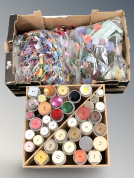 A very large quantity of Anchor wool in various colours, the majority in 8 metre lengths, and an assortment of buttons. (2 boxes)