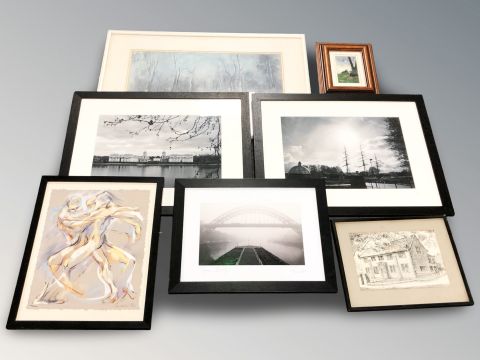Joan Baker : Moonlit Pool, watercolour, 27 cm x 54 cm, together with several further pictures and prints, a T R Meadows watercolour study of two badgers, etc.