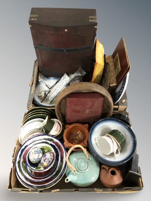 A quantity of Spanish and other pottery bowls, cloisonne trinket boxes, Chinese turqouise glazed tea pot, a small trunk, cutlery, crystal bowl, etc. (2 boxes)