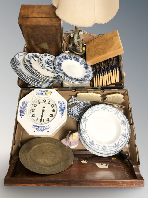 A cased set of fish cutlery, a walnut table box, figural lamp base, blue and white transfer printed dinner wares, dressing table brushes, an Indian bone inlaid serving tray, etc. (2 boxes)
