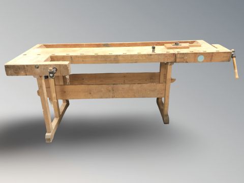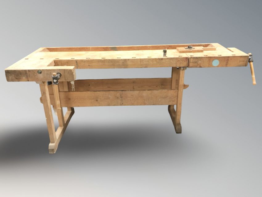 A large 20th century pine workbench fitted with two vices, 220 cm L x 96 cm D x 83 cm H.