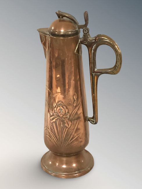 An Arts and Crafts copper tapering jug with lid, stamped GBN, height 36 cm.