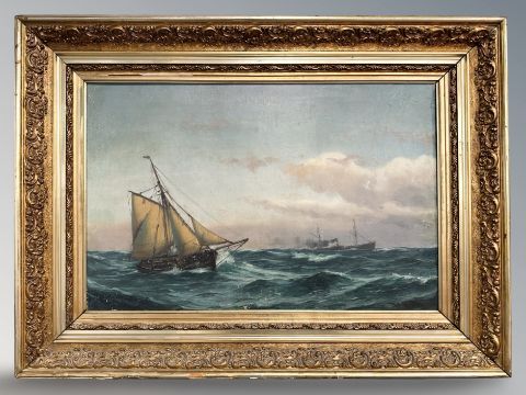 Danish School : Sailing boat in rough sea, oil on canvas, 67 cm x 43 cm.