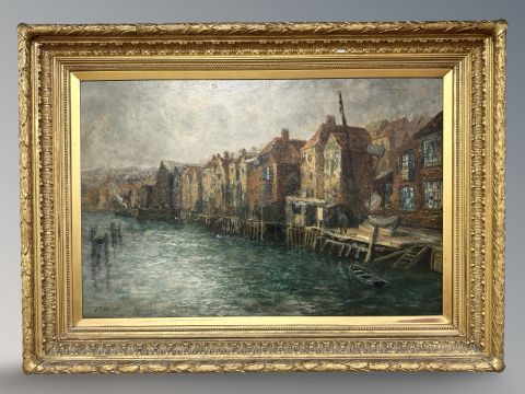 John Falconar Slater (British, 1857 - 1937) : The Dolly Quay, oil on board, 60 cm x 90 cm, with The Hatton Gallery exhibition label verso, framed. ** This painting formed part of the "Every Home Should Have One" exhibition held by The Hatton Gallery between November 2000 and January 2001.**