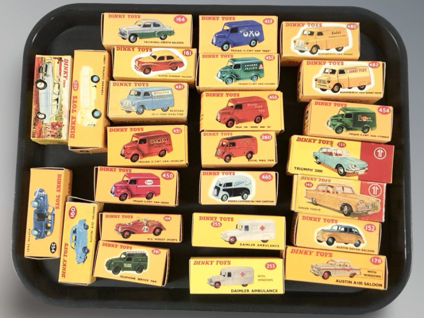 A collection of reproduction Dinky die cast cars and delivery vans, as illustrated.