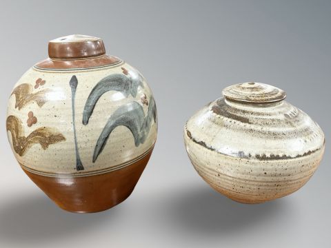 David Frith (1943- ) A glazed stoneware bulbous jar and cover, height 31 cm. Together with a similar David Leach (1911-2005) lidded vessel, each with impressed seal mark. (2)