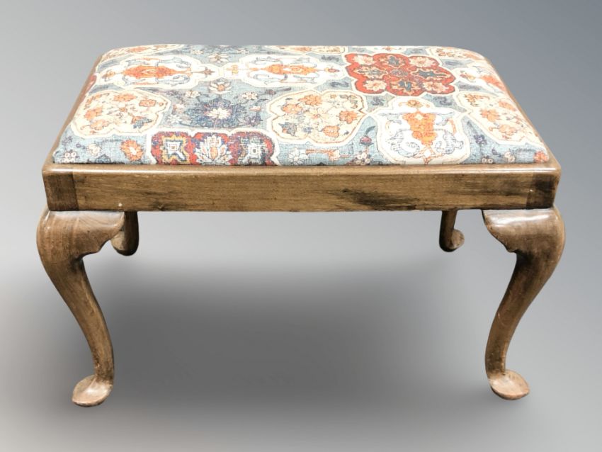 A 19th century mahogany stool on pad feet, width 78 cm