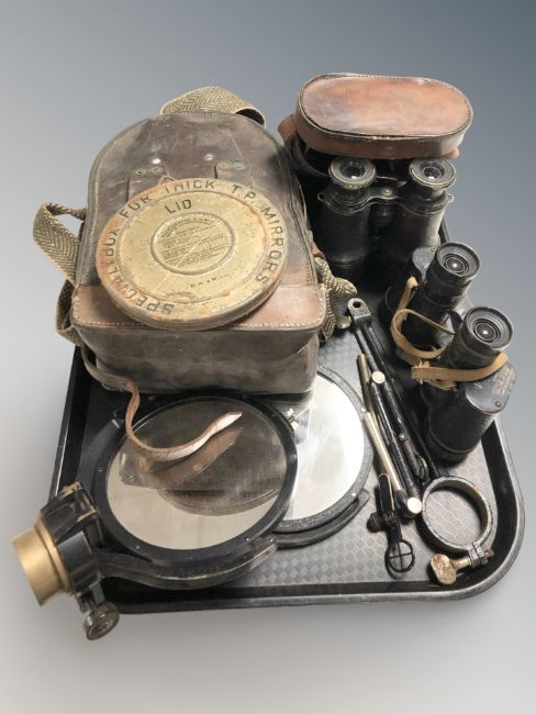 A pair of Taylor-Hopson binoprism No.2 Mk III field glasses, dated 1943, a further pair of field glasses by Lemaire, Paris, refracting mirrors, etc.