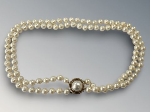 A good quality double strand pearl necklace on 18ct yellow gold clasp set with a mabe pearl, length 46 cm