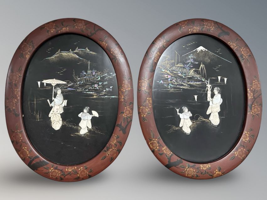 A pair of Japanese Meiji period Shibayama lacquer panels depicting ladies in a landscape, in oval lacquer frames, each 54 cm x 41 cm overall.