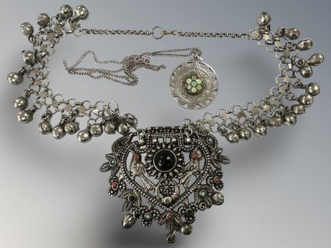 A silver millefiori glass disc pedant on chain, plus a further decorative silver-plated necklace