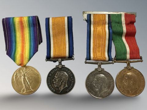 A pair of WW I medals including the Mercantile marine medal awarded to Ernest Angus, together with a further pair of WW I medals awarded to T Z 9226 A Hall AB RNVR.