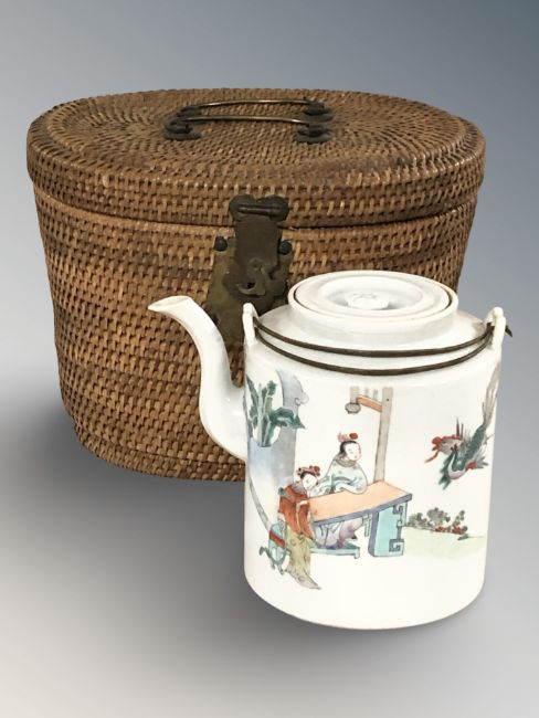 A late 19th century Chinese export porcelain tea pot depicting ladies in a garden observing a pheonix, four character mark to base, height 19 cm including handle, in original wicker carrying basket.