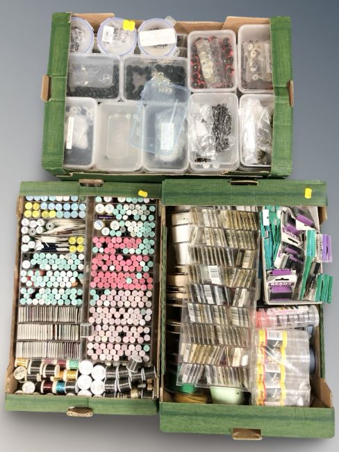 A large quantity of haberdashery supplies including beads, lengths of suede, spools of thread, ribbon, etc. (3 boxes)