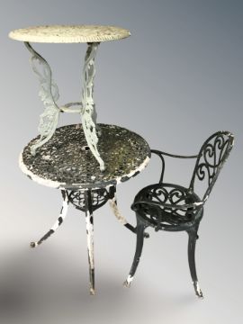 A painted metal circular garden patio table, diameter 74 cm, a smaller table, a chair and a woven plastic rug